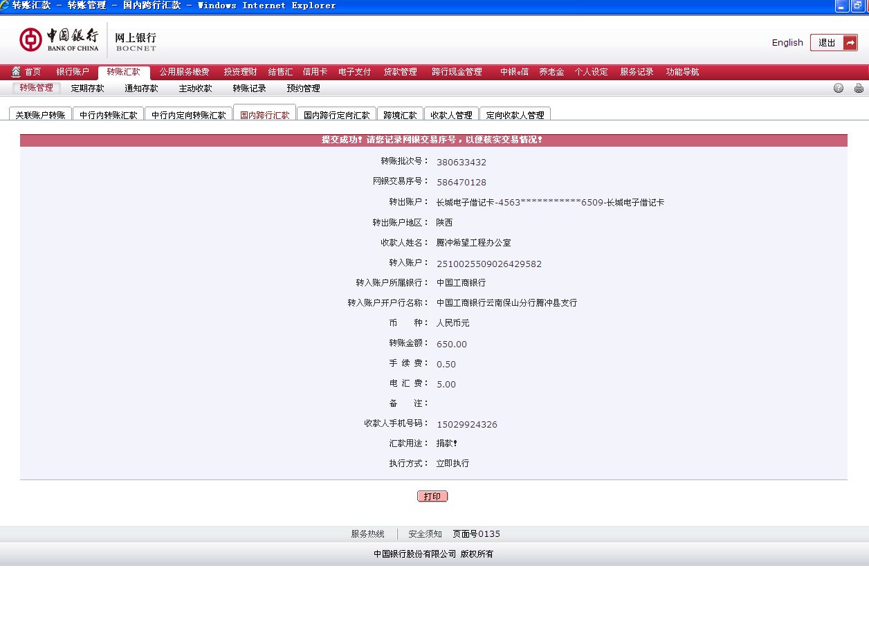 | 回单类型 | 网上转账汇款 | 指令序号 | HQH000000000001536665445 | 付 款 人 | 户 名 | 陆洪 | 收 款 人 | 户 名 | 腾冲县希望工程办公室 | | 卡(账)号 | 6222000200103455275 | 卡(账)号 | 2510025509026429582 | | 地 区 | 北京 | 地 区 | 保山 | | 网 点 | 工行北京分行业务处理中心 | 网 点 | 工行云南省保山分行东路支行 | | 币 种 | 人民币 | 钞汇标志 | 钞 | | 金 额 | 1,000.00元 | 手续费 | 2.50元 | | 合 计 | 人民币(大写):壹仟零贰元伍角零分 ¥1,002.50元 | | 交易时间 | 2011年10月18日07时48分 | 时间戳 | 2011-10-18-07.48.11.536368 | | 用 途 | 义拍款 | | |  | 附言: