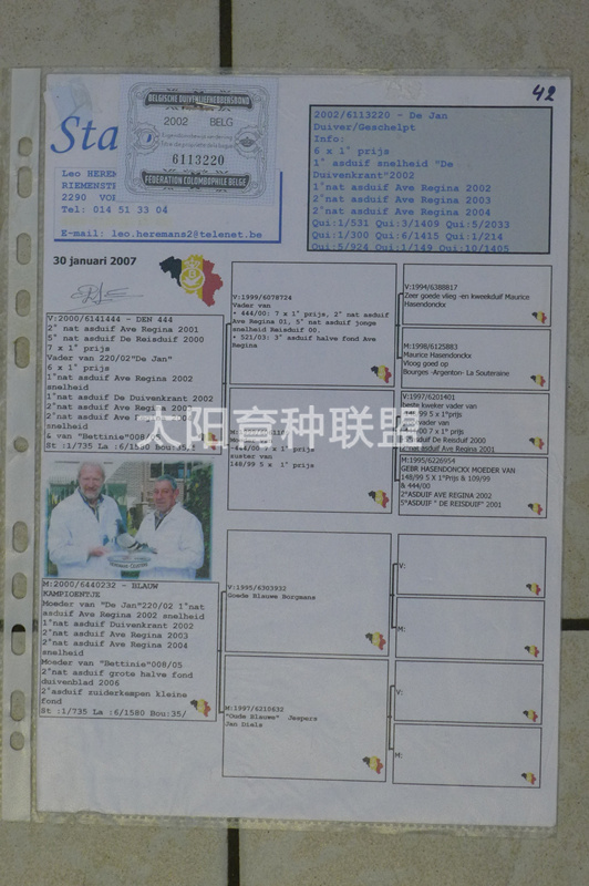 这就是横扫德国的超级鸽友辉帕,用的鸽子血统来自利奥·赫尔曼斯。获得第一、第二、第四、第六、第七、第八