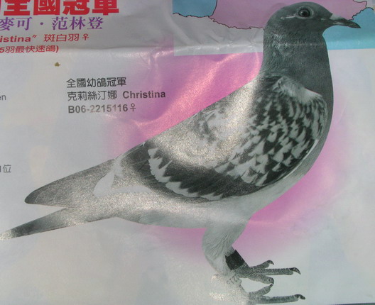 拉斯特连幼鸽13918羽全国冠军.麦克.范林登 B06-2215116 (Christina)\'\'班白羽雌 睽违比利时20年的麦克.范林登.四年前带着他的台湾老婆及女儿回到家乡后.重返赛鸽战场上.三年内总计拿下五次全国赛冠军.一次半全国冠军. 证明他不但宝刀未老.加上他在台湾这些年累积的竞翔经验.缔造如此惊人的赛绩.精湛的表现让他一回国马上声名大噪. 冠军鸽Christina不但拿下幼鸽组全国冠军还以分速1378.32公尺于当天下午16:23第一羽归返成为全国17545羽参赛选手最快速鸽.除了幼鸽冠军.全国前30等还入赏幼鸽20位.老鸽13位的好成绩