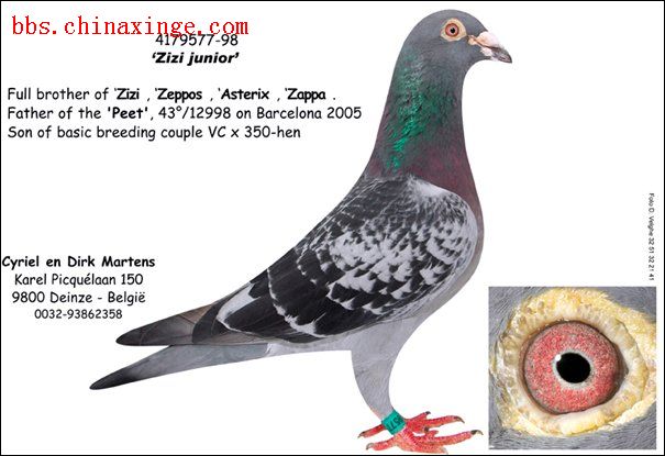 说明部分转自pipa:马顿父子(Cyriel & Dirk Martens)为长距离世家,以乔治.卡度斯和范德维根的鸽子打下根基。2003~2004年,他们的两只鸽子分别夺得KBDB全国超长距离鸽王6位及全国超长距离鸽王7位。 KBDB全国超长距离鸽王6位珍宝号(Jumbo),盖比看上了,可惜一身黑斑,讨不了盖比的欢心。卡罗医师(Carlo Gyselbrecht)窃喜,赶紧把他带回家。马顿父子俩一学医, 一学药,养鸽事业上亦合作无间。2005年橘郡(Orange)比利时全国冠军丹尼尔.阿仁斯(Daniel Aerens, 亦是2004波城全国2位得奖者)早就找来这里,带了几对鸽子回家。比利时猛虎克利斯.赫博瑞(Chris Hebberecht)也有在用(珍宝号全妹)。 珍宝号直子辛巴(Cimba)为马顿父子飞出卡奥尔全国43位 ....卡罗医师作出的珍宝号直子女亦已陆续飞出成绩。