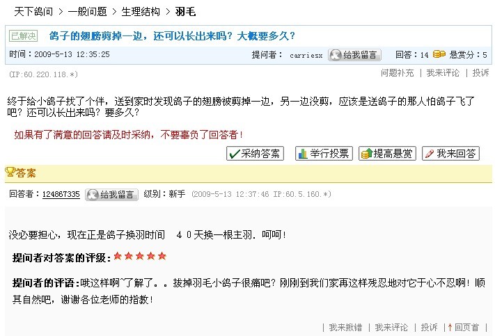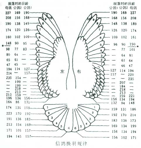 楼主自己慢慢学吧, 请注意,对图看你的鸽子掉的是那几羽大条...... 留意看每羽大条替换,需要时间的多少....... 另:非正常脱落的羽毛,生长的速度会比正常替换的快些...... 如果楼主来论坛学习, 本人愿意交流, 如果您是来发泄的, 就请您自娱自乐吧(本人绝不再跟贴)......
