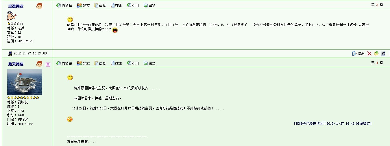 | -- 作者:天地翱翔 -- 发布时间:2012-11-27 19:25:55 -- 看你鸽子换毛慢所以拔掉了。。。哈哈 这样的飞行,一般也就2天能回来不错啦。 |