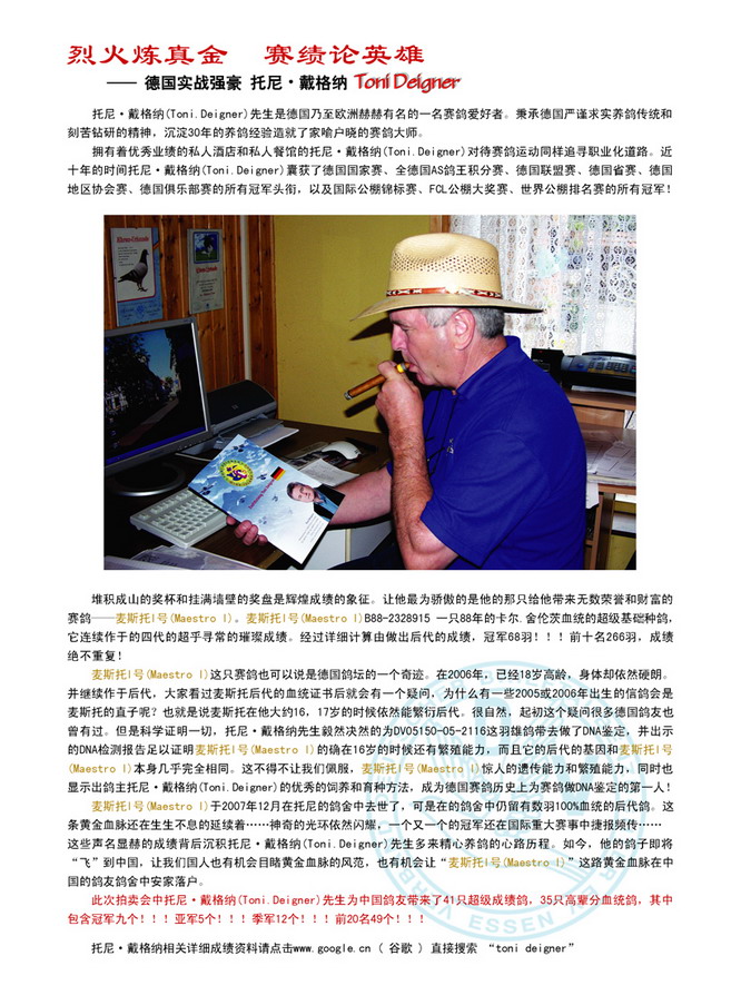 而其他小比賽太多1位 我們就不在此詳述 註:"梅士一號"為一隻完全沒有賽績的偉大名種鴿 生來為種 首先感谢,楼主和黄先生 翻出我这篇 拙作。 同时也让我了解到麦斯一号一些不为我知的到事情。我很荣幸,作为托尼.戴格纳先生中国总代理, 可以有机会鉴赏到这路铭血的后代。 现将“麦斯托一号的照片献给大家。 其他关系麦斯托一号家族详细资料, 我已经汇总至以下网址: 请喜欢麦斯托血系到朋友浏览。 www. 中德赛鸽 . cn 总代理 中德赛鸽文化交流中心 QQ:980718999 [此贴子已经被作者于2009-6-16 16:44:01编辑过]