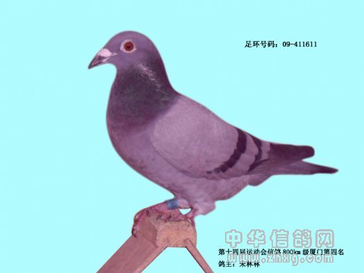 | -- 作者:城南鸽痴 -- 发布时间:2010-11-17 11:06:05 -- 神奇种母”疾速号“ 02-09-021929母 疾速号 2002年上海市800公里厦门大赛:700位 2003年上海市800公里厦门大赛:131位 2004年上海市800公里厦门大赛:17位 大奖赛:8位 2006年上海市800公里厦门大赛:98位 区赛300--500公里亚军及前10位不计其数,逢指必赢(各种气候均赛) 唯一配对公(疾速号表兄)2002年 灰 黄 公 组成绝配,后代赛绩如下: 1、直女2004-09---------班 黄 2007年上海市800公里厦门大赛:67位 作出(再次远亲配):2010-09-339194 灰 砂 公 获:奉贤区400公里幼鸽精英赛:8位 2010年上海市800公里厦门大赛:302位 2、直子2009-09-410707 班 砂 公 2010年奉贤区一岁鸽:4位 3、直女2009-09-410705 班 黄 母 2010年上海市800公里厦门大赛:301位 4、直子2009-09-411611 灰 黄 公(下图) 2010年奉贤区300公里:指定鸽9位 1000公里:15位 2010年上海市厦门800公里大赛:4位 指定赛:100组:冠军 200组:冠军 2009-09-411611 公 [此贴子已经被作者于2010-11-17 11:44:26编辑过]