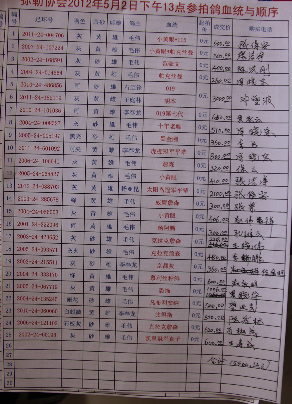 友情说明: 表中鸽主一栏“鸽主”就是义捐信鸽的主人!向义捐鸽子的鸽友致谢!!! 表中“购买人电话”一栏的姓名,就是每一位购买义捐信鸽的鸽友!!!也万分感谢!感谢义买鸽友!!! 记录这些的目的:这是义捐义卖公益活动,必须实事求是、留下原件【照片】、随时可查,便于大家监督。谢谢! 义卖信鸽款共计15612元,第一次写错了【15600.12元】最后改正:15612元。