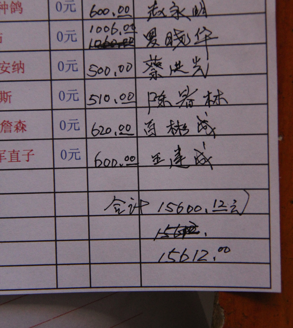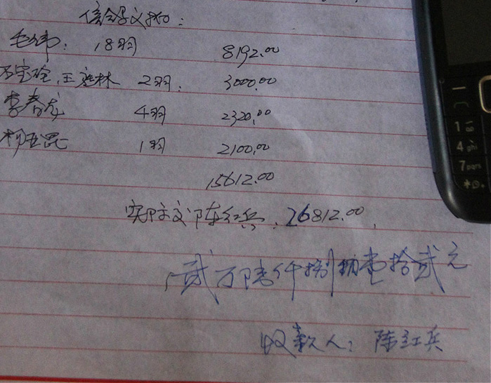 不幸遭遇车祸的云南彝族鸽友陈红兵在捐款清单上签字: