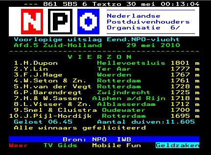 本来这次是五区当日归6月12日亚精顿700公里赛的,由于昨天放飞点有雷雨故而没开笼,但在天气预报里报道13日早上一直有大雾,所以NPO决定将鸽子拉回奥尔良放飞,因NPO考虑到赛鸽今天如在亚精顿放飞,要在中午才可以开笼,又是逆风如迟归的鸽子鸽子需要飞十几个小时,有的要第二天礼拜一才到家,拜四又要装笼,拜六450公里中距离赛,担心拜四上笼的鸽子会不多,为了使大家下次的参赛不受影响,才由NPO几位负责人开会做出了决定. 这次前百名获得者,我们所认识的几个五区里的老外以外,还有我们中国鸽友,威廉-狄布恩获亚军,21,22,24,27,29,45,70,88,波西瓦4,5,中国鸽友林勇14,16,69,皮得-米卫15,67,68比得-米卫20,杨欧瓦克49,83,85.前10名获得电视网奖. 这次是荷兰当日归长距离的第三场赛,中国鸽友林勇先生在目前的三次比赛中都取到了优良的成绩,第一场奥尔良他获得了第十五名,第二场维尔松他获得了亚军,这场获得了第十四名,下面接下去还有三场长距离赛,希望林先生能再取到好的成绩,为我们中国鸽友争光. 第一场林先生取得NPO15名的鸽也是这次获16名的同一羽鸽子,NL08-1587454 AFDELING 5 E19 ORL葾NS SARAN MET 10660 DUIVEN OP 15-05-2010 LOS 08.00 UUR. RAYON WEST MET 5515 DUIVEN, RAYON OOST MET 5145 DUIVEN APL RPL NAAM PLAATS RINGNUMM V AD/PR GET AFSTAND ZUIV.TYD MET/MIN AFDPNT RAYPNT BEDRAG 1 1O Piet van de Merwe Dordrecht 7-1828594V 27/13 10 475,017 14.34.25 1204,350 1000,0 1000,0 2 2O Jan Mudde Krimpen a/d IJs 7-1768858 6/2 6 482,790 14.42.13 1200,323 999,6 999,2 3 1W Comb Anders Boskoop 8-1561284 6/2 3 500,138 14.57.42 1197,362 999,2 1000,0 4 3O Marijke Vink Mookhoek 8-1522926 14/11 2 465,738 14.30.09 1193,739 998,9 998,4 5 2W L. Barendrecht Middelharnis 8-1497169 12/4 4 454,799 14.21.45 1191,348 998,5 999,3 6 4O L. van de Heuvel Nieuwerkerk a/d 8-1573741 8/6 4 489,169 14.54.36 1179,857 998,1 997,7 7 5O T. Hubers Papendrecht 8-1581132 8/3 5 477,210 14.44.32 1179,608 997,7 996,9 8 3W Comb Heijne Hazerswoude-Dor 9-1207765 4/2 2 502,389 15.06.22 1178,303 997,4 998,5 9 6O D. Boelhouwer Jr. Ouderkerk a/d I 8-1493270V 5/3 4 486,922 14.53.49 1176,662 997,0 996,1 66,48 10 4W V. Griffioen Leimuiden 7-1864550 6/2 2 515,977 15.18.43 1176,105 996,6 997,8 11 7O P. Vink Reeuwijk 9-1190384V 11/4 5 501,399 15.06.37 1175,291 996,2 995,3 12 8O H. de Jong Strijensas 7-1802361 38/12 4 462,643 14.33.40 1175,166 995,9 994,6 13 9O A. Nederveen Hardinxveld Gie 9-1204734 19/12 2 480,902 14.49.28 1174,412 995,5 993,8 14 10O P. Timmer & Zn Hardinxveld Gie 7-1836027V 14/7 11 482,105 14.51.29 1171,626 995,1 993,0 15 5W Y. Lin Ter Aar 8-1587454V 50/20 7 511,409 15.17.09 1169,869 994,7 997,1 16 6W Gebr. Wagemans Achthuizen 8-1499663 14/6 4 450,982 14.26.10 1167,842 994,4 996,4 17 11O D. Boelhouwer Jr. Ouderkerk a/d I 7-1768627V 5/ 1 2 14.57.19 1166,794 994,0 992,2 33,24 18 12O D. Leeuwerke Klaaswaal 7-1764509 30/18 5 464,364 14.38.04 1166,549 993,6 991,4 19 13O Piet van de Merwe Dordrecht 7-1828586V 27/ 3 2 14.47.12 1166,541 993,2 990,7 20 14O J.J. Krijgsman Lekkerkerk 9-1143146V 8/5 5 483,181 14.54.18 1166,213 992,9 989,9