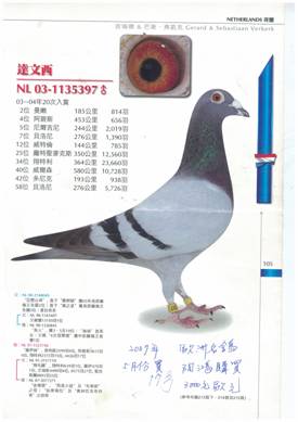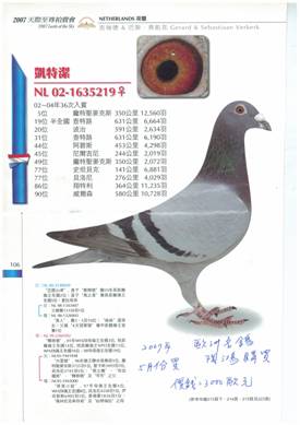| -- 作者:yonglin -- 发布时间:2010-12-29 3:41:05 -- 以下是引用shwlmyh在2010-12-28 22:35:19的发言: 成绩是不错,人也鸡贼的很,在加上国内的鸡贼福子,淘汰下来的鸽子全弄到中国来了。 佛科克父子在08,09这两年每年进一轮种鸽棚种鸽出的幼鸽进中国拍卖,难道这就是要淘汰的鸽子吗?09年因他们要搬家,留了超级种鸽及奥林匹克鸽王,做为种鸽,其他的比赛的鸽子以及一部份鸽王全去了中国,由北京的张金福(鸡贼福子)代理拍卖。可以说这批是他淘汰下来的鸽子,但你不要忘了,他们如没有这次的搬家,这些赛鸽他们是不会放手的,他们也是无奈,佛科克的鸽子是早熟鸽子,他家只有幼鸽和一岁鸽参加比赛,很少有三岁的鸽子参赛,如有的话也是巴斯知道这羽鸽一岁时已飞的很超级,如再飞一年好成绩就可获奥林匹克鸽王,因奥林匹克鸽王一定要二年的超级赛绩才能有资格参选。奥林匹克鸽王选举是两年一届,就拿他家的09年奥林匹克鸽王“索朗”是一羽07年的鸽子,07,08都飞得很好了,但奥林匹克鸽王是09年要选的,因为他们自已认为索朗再飞一定能拿奥林匹克鸽王,所以09年才让再飞一年,在这样的情况下才见他们有三岁的鸽子出现参赛,他们所获的鸽王都是幼鸽的成绩和一岁鸽所获得到的。09年这次拍卖鸽要是10年继续参赛鸽王就会产生在这批拍卖的鸽子中。 07年他的20羽赛绩鸽进了台湾,其中有羽冲刺号的全兄,就是亚历山达的儿子,09年在台湾这羽鸽的子孙下代,给鸽主赢了60多万的欧元,作出下代今年五关赛前两关又获两关冠军,第三关12月26日比的还未收到消息。按你的说法他们家淘汰的鸽子都这么历害了,难怪他们在荷兰的赛绩这么棒,你是否有点太挎张了吧? 下面这两羽就是台湾鸽友在07年时拍到的两羽佛科克的赛绩鸽,但当时拍到的价很低,今年这鸽友又进了这几羽的半兄妹,但化了这两羽的钱只买一羽10年的幼鸽,今年连冲刺号的孩子都被台湾鸽友定个光。 ![]() ![]() ![]() 此主题相关图片如下:![]() 此主题相关图片如下:![]() [此贴子已经被作者于2010-12-29 4:10:14编辑过]