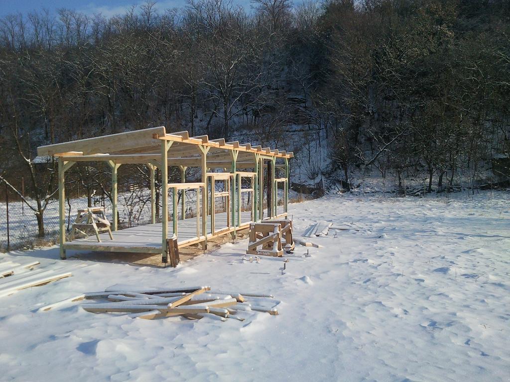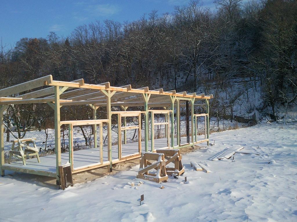 鸽棚长10米宽2.5米内高1,9米,分5间。 外面完成了,里面还没有完全搞好,先让鸽子凑合住吧,晒鹏桩做好了天气转暖在做。今天外面零下17度,要命。