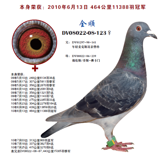 2010做出3窝鸽子,第2窝交的秦皇岛三毛公棚,预赛28名 77名,决赛32名 34名,鸽王9位,11位,还荣获1000元组亚军 季军 一把抓冠军,本地500公里大奖赛冠军 4名 13名 丢了一只,6只入赏5羽,非常感谢您能做出这样优秀的种鸽,再次感谢!!!可以联系QQ;421113124