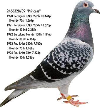 De92、De14及NL76-578113、NL77-1717515等等,先后取得巴塞罗纳国家赛第3、7、11、13、21......名,曾孙获得1993年巴塞罗纳国际冠军!这些鸽子不仅都在巴塞罗纳身经百战名列前茅,而且具有非凡的优异遗传能力。九十年代世界长距离强手荷兰的威姆.凡.李文(Win Van Leeuwen)、“打遍天下无敌手”的乔斯.托尼都曾以古柏兄弟鸽系为基础鸽,亦都得益于古柏兄弟的这批战将。更有趣的是众多的战神却都同出自古柏兄弟的一对黄金种鸽H71-1393807♂和H69-1257869♀有血缘关系。