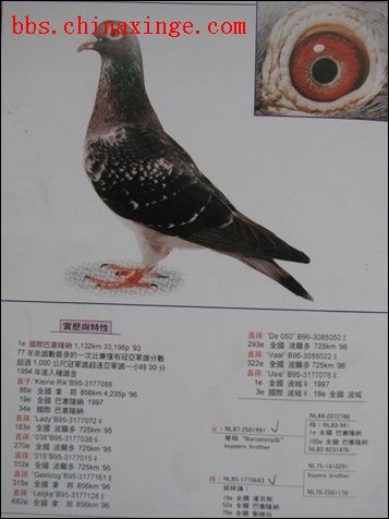 由NL94-1881320的作育过程来看,古柏兄弟是继续保持凡.王路易“807”的优势,黄金配对的血统仍占主流,祖父、祖母、外祖父、外祖母均含有凡.王路易(104、892)及黄金配对(128、623)等优良种鸽,但他们同时启用杂有马特琳外路血统的NL83-1062082B♂和NL78-0929098BC♀这两羽同血统的优秀杂交种鸽。古柏兄弟用马特琳的B73-2391786♂去杂交他的巴塞罗纳28获得很大成功,NL83-1062082直女“帕翠克斯”曾获1988年22931羽参赛的达克斯国家赛亚军,1989年26305羽参赛的圣维仙国家赛冠军,并取得了全场43698羽最快速度。NL83-082之姐姐NL78-098“波城后”曾获1983年巴塞罗纳国际赛第9名、1981年有2553羽参赛鸽的波城国际赛亚军。此外平辈兄弟还飞巴塞罗纳国际赛37名,圣维仙全国77、82名,波尔多(831KM)国际赛51名等,杂交可谓取得很大的成功。古柏兄弟引进的E.马特琳的这一路B73-2391786是什么品系的鸽种?人们不禁要问,大家一定会认为:不是杨阿腾、凡.王路易,就是狄尔巴、戈登。 我猜鸽友们想都想不到这是一路地道的比利时卡特利斯五十年代风靡世界的老牌名系“45号”,赛鸽育种巨匠们往往都有这样一种大手笔。卡特利斯的加盟改变了古柏种系血统的成份,重塑古柏兄弟种系九十年代新风貌,使得古柏兄弟更加英姿焕发。 97年比利时卡罗医生的巴塞国际冠军的母亲也是卡特利斯,这只母鸽的眼睛很像考夫曼的黄金女郎的眼睛.