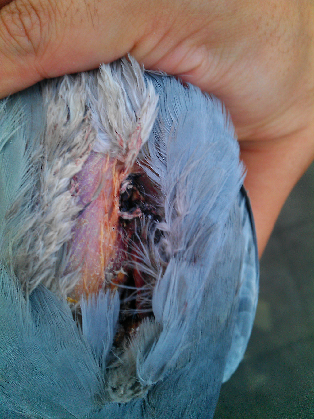 一羽夏季特比几周前家飞未归,今天回来了。龙骨一道深深的血沟,右腿折断,腿骨截面外露已黑,只能用左脚站立。不知道这几周是怎么熬过来的。。。腿骨下部断处已经结痂长肉,腿骨上部断处歪露出,还能接回去吗?它的比赛生涯已经结束了,这么拼命回来的,淘汰掉实在是下不去手,请教接腿良方。