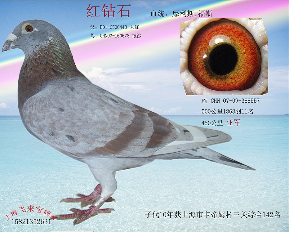 此鸽为08年第一批幼鸽,特比环为07秋发行。隔年秋季一岁鸽三关赛环。当年训放到一百五十公里参加三百五十公里比赛归,接着在七天后的五百公里获十一名。来年春天,训放到两百公里上四百五十公里比赛获亚军。