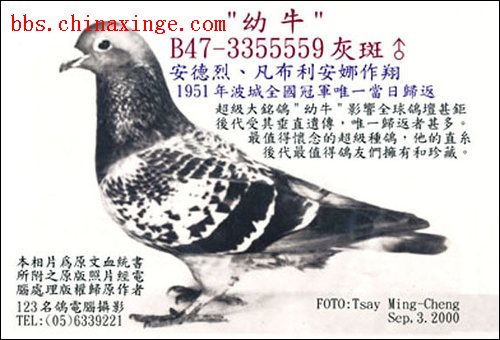 这几天着重找了一下凡布利安娜的资料,凡布利安娜使我折服,因为至今为止只有他一人是用一只鸽子创造了鸽界文明的鸽系,这就是“老牛号”。凡布利安娜系最擅长飞燠热和逆风的天气,老凡布利安娜在比国参赛,若遇到天气为燠热和逆风时翔绩都很好。凡布利安娜系被引进台湾后,确实在燠热和逆风的天气,有超强的实力常常入赏,所以凡布利安娜系的特性就是不怕燠热和逆风的天气。此主题相关图片如下: