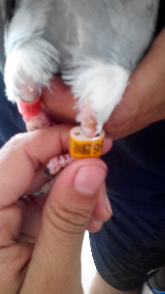 那只鸽子另一个腿上是特比环,这个环子问了当地鸽友都是没见过