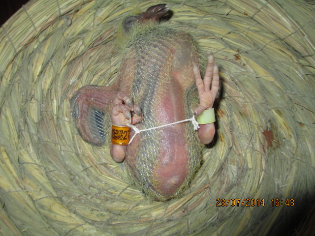 7日龄.5天套环,6天发现有点撇腿,7天更厉害了,不是草巢的事,是太神经了,有点动静就闹腾,上镣校正.