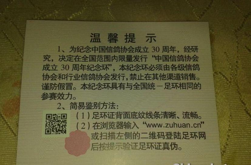 岁末年初,中鸽协为纪念成立30周年发行了纪念足环,虽然我没买到,但从网上看到已有鸽友领取了这种足环。