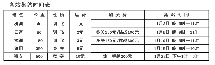 沙田(50公里)3月7日周六18时-21时3月8日周日(晨)3元训放 惠东(80公里)3月14日周六18时-21时3月15日周日(晨)4元训放海丰(130公里)3月21日周六18时-21时3月22日周日(晨)5元训放陆丰(150公里)3月28日周六18时-21时3月29日周日(晨)6元测试赛 汕头300KM4月11日周六18时-20时4月12日周日(晨)15元普赛 汕头300KM4月18日周六18时-20时4月19日周日(晨)20元普赛、指定、争霸关赛插组 翔安500KM4月25日周六12时-14时4月26日周日(晨)30元普赛、指定、争霸深圳信鸽协会,估计没有你这贵的了吧。