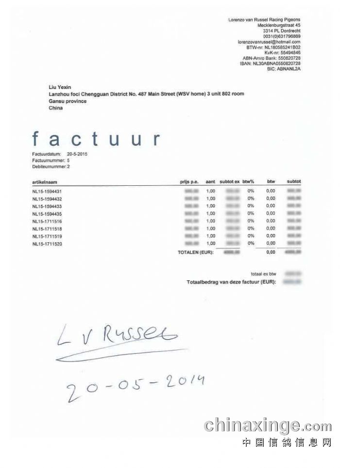 | -- 作者:妃子笑 -- 发布时间:2015-6-30 22:24:51 -- 荷兰鸽友交兰州鼎盛公棚8羽!! 外国鸽友来中国参赛,他们不顾忌地方差异会给参赛鸽带来影响,从中可以看出他们对自己鸽子的自信,也有一种大胆尝试之意,我觉得他们也在一直关注国内的各个公棚,这次荷兰鸽友选择兰州鼎盛公棚,我觉得他肯定在气候、地区、塞线、等,还是做了不少的功课,从中可以看出,他们对我们的公棚赛事有很高的关注度,他们现在是投石探底阶段,等他们试验成功后,我觉得他们以后的比赛很有可能都会定在中国,因为他们也感觉到了自己国家赛鸽需求量以进去“饱和”状态,中国却刚刚开始大量需求! ——甘肃-永靖-剑翔鸽舍 荷兰著名鸽友LorenzovanRussell发鸽报关凭证 |