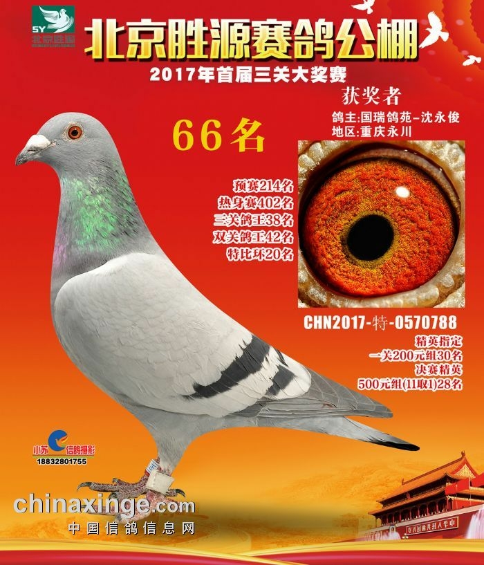 本舍13年通过德国优纳国际拍卖的一羽09年灰色砂眼德国原环雌鸽通过这几年的在地方赛和公棚的不断比赛检验,证明了它确实是一羽不可多得的超级种鸽,它的父母皆为连续几年的鸽王级别的血统也证明了这绝非偶然!引进回来第一年配贺尔梅斯原舍雄就就作出重庆齐圣翔公棚首届决赛殿军,地方赛冠军,配德国优纳的一只贺尔梅斯/凡龙赛绩雄鸽作出去年北京胜源公棚决赛66名本地地方赛七一杯统排冠军领先近一个小时,昨天成都凯翔公棚第四关决赛秦岭515公里45名,艰难赛事,全线高温当天只归巢128羽!目前四关成绩为828+149+46+45名,鸽王名次暂时还没统计出来,应该能进王名次。