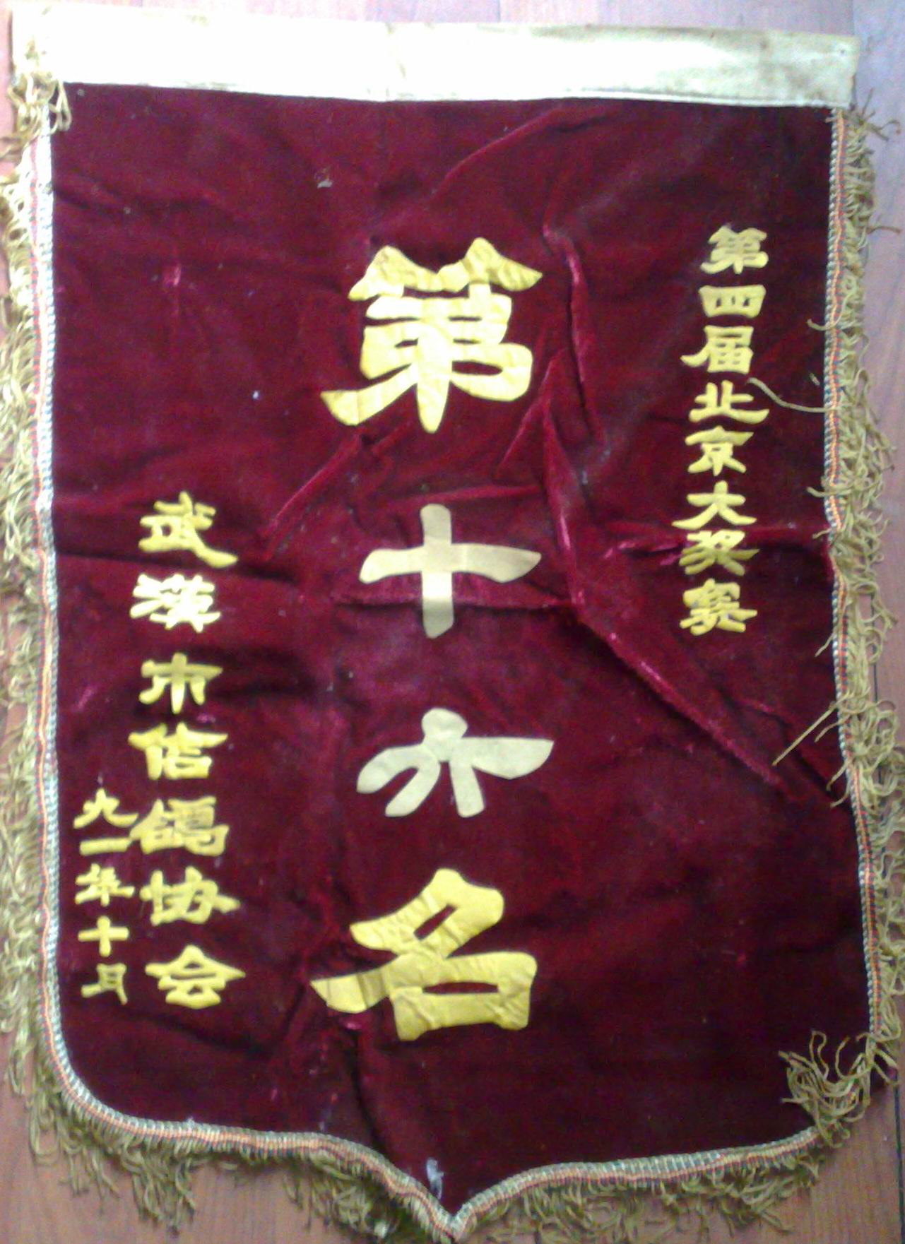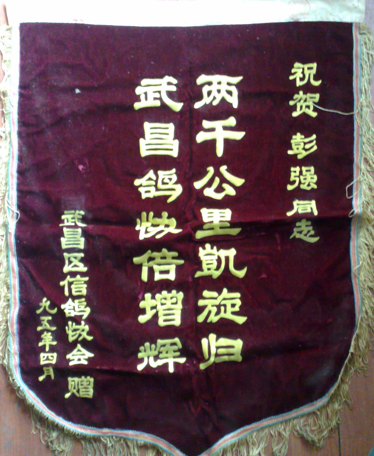以下是引用磁州窑鸽舍在2011-9-30 16:13:55的发言:一面旗子是我们回忆过去,是我们难忘那段刻骨铭心的历史,对自己对他人都是一种激励。 武昌区曾给我发过一面锦旗,说起来还有一段故事。 早年武昌区回过两次2000公里冠军,但后来武昌区就一直没2000公里归巢鸽,04年鸽协领导发话,今年谁回2000公里,就给谁奖励,结果被我破了门,但遇到鸽协的资金被他们用得差不多了,领导给我说好话,用锦旗代替奖品!