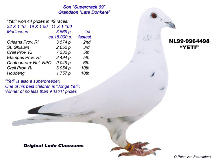 | -- 作者:老徐 -- 发布时间:2011-12-30 6:05:24 -- 老婆送我的圣诞礼物--小白 名人玩“天落鸟”,那叫慧眼识英雄。也可以叫“伯乐”。呵呵,哈哈。还是我的那句老话:故事总是在成功以后才写的。 一天,鲁道克拉森发现后院来了一羽白色的鸽子。不知道他有没有用水或饲料什么的引诱鸽子,反正他逮到了这羽白鸽。他打电话给比利时皇家信鸽协会查询这羽鸽子的主人,结果发现这羽白鸽的主人已经去世了。老克很喜欢这羽鸽子,然后用它出了鸽子参加比赛。我勒个去,这羽白鸽出了很多超级的赛鸽和种鸽。作为父亲或祖父,可圈可点的鸽子有: Yeti (NL 9964498-99) 1st Morlincourt 15,000 birds Casper (NL 9835807-98) 1st Perrone 4,191 birds White Cloud 8th Niergies 4,339 birds Cinderella 10th Nijvel 2,281 birds White Diamond 1st Nijvel 2,348 birds 这羽鸽子后来被称为“天上掉下来的馅饼”,哈哈,应该叫“天上来的礼物”(The Gift from Heaven)。再后来,这羽白鸽被甘那斯同志买回了美国。取名“GOLDEN WITTEN”。WITTEN就是白色的意思。我勒个去,这鸽子的后代很好卖,1500美元一羽,经常脱销。当然,不断地有些捷报从买主那边传来。“金白”一下子在美国热了起来。。。 我家也有路白鸽,那是起源于“喜端鸽舍”的白色大盗(BANDIT)。说实话,这路鸽子很好用,但就是怕被老鹰吃掉。从用它们起,连续2年有白鸽子进入了AU ACE 排名。当然,它们的排名位很低(可能因参赛鸽数少,积分上不去),不值得一提,但足可以证明这路鸽子的稳定性。没有4场进入前10%的鸽子,连排名的资格都没有。 我很想把这路白鸽子玩下去。咱往里加点凡龙,咱也加点黒根,嘿嘿,咱也可以试试加点“金白”。 老婆送了我一羽双重“金白”直孙的小白雄作为今年的圣诞礼物。呵呵,谢谢老婆! 我给小白雄取名“MY WITTEN”, 我的白鸽。俺会用它去配我最好的白雌们,看看它们能不能飞出来。 小白雄的父亲原是老甘家自留种鸽(AU 00 GFL 167),“金白”配“VITESSE”作出。167育出了GFL138/2002,3次第一名,2002年ACE排名全美第六名。 小雄的母亲以前也是老甘家的自留种鸽(AU 00 GFL 358),由“金白”配“PICANOL VIII”作出。358的育绩无法考证,但从它一直与老甘家大名鸽“TOPO”配对来看,足以看出358的实力。 “我的白鸽”,加油!迎战2012! [此贴子已经被作者于2011-12-30 6:57:15编辑过]