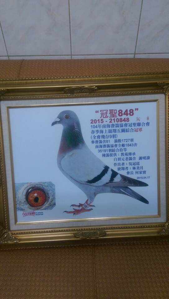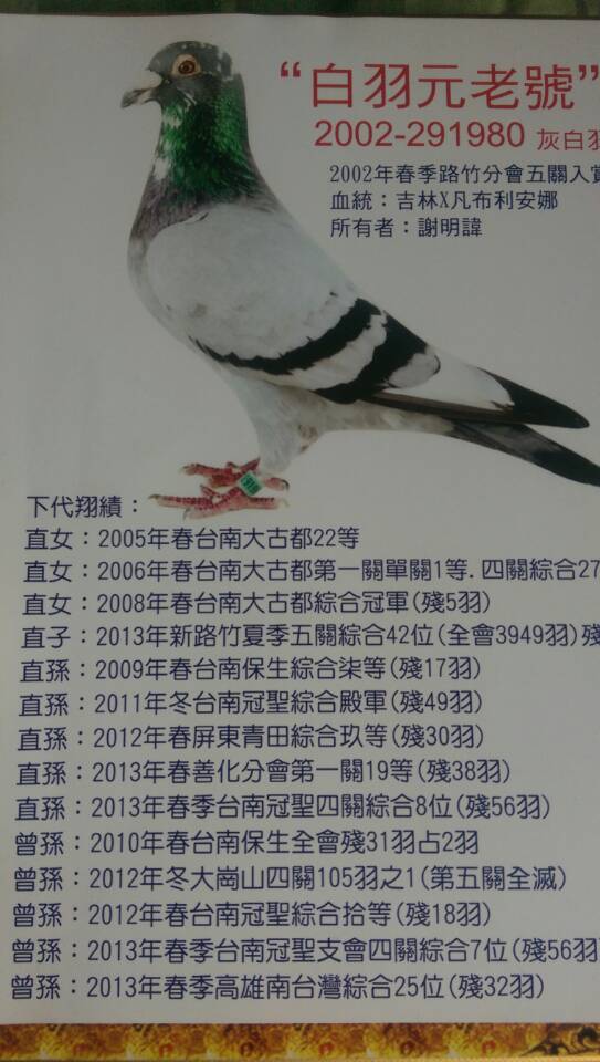 目前公棚赛事越来越残酷,决赛当天经常会出现“海翔式残存”归巢寥寥无几,这就需要有耐力,抗造的鸽子,论坛的朋友天马阿克琉斯曾经说过,交公棚的鸽子必须具备飞七个小时的能力,为了适应这种残酷激烈的公棚赛事,适当的引进一路台湾优胜鸽,就当纯粹试验,经过朋友推荐和自己上网搜索台湾的赛绩表,目标锁定台湾白羽元老鸽舍。今天下午接到天进制冷韩总通知去他公司欣赏来自台湾白羽元老鸽舍的两羽赛鸽,白羽元老号血统的灰白条雄鸽,上手结构很紧凑,中长龙骨,龙骨耻骨基本在一条线上,竹筒型身形,很典型的台湾鸽子,中规中矩,最出彩的是翅膀非常完美,膀轴厚度更是惊人,明年把试验的结果发到论坛,与论坛朋友分享。